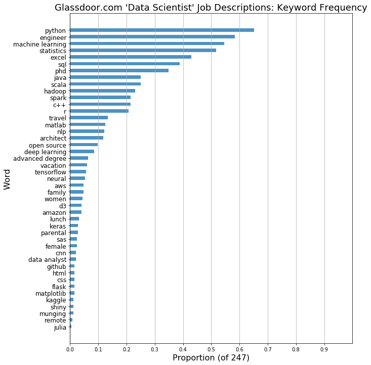 I honed in on the “Computer and Information Research Scientist” category, requiring “Python” as a keyword and excluding “Excel” in the job description, etc. Before doing that, I plotted a bar chart to show the frequency of various words and phrases in the job descriptions: